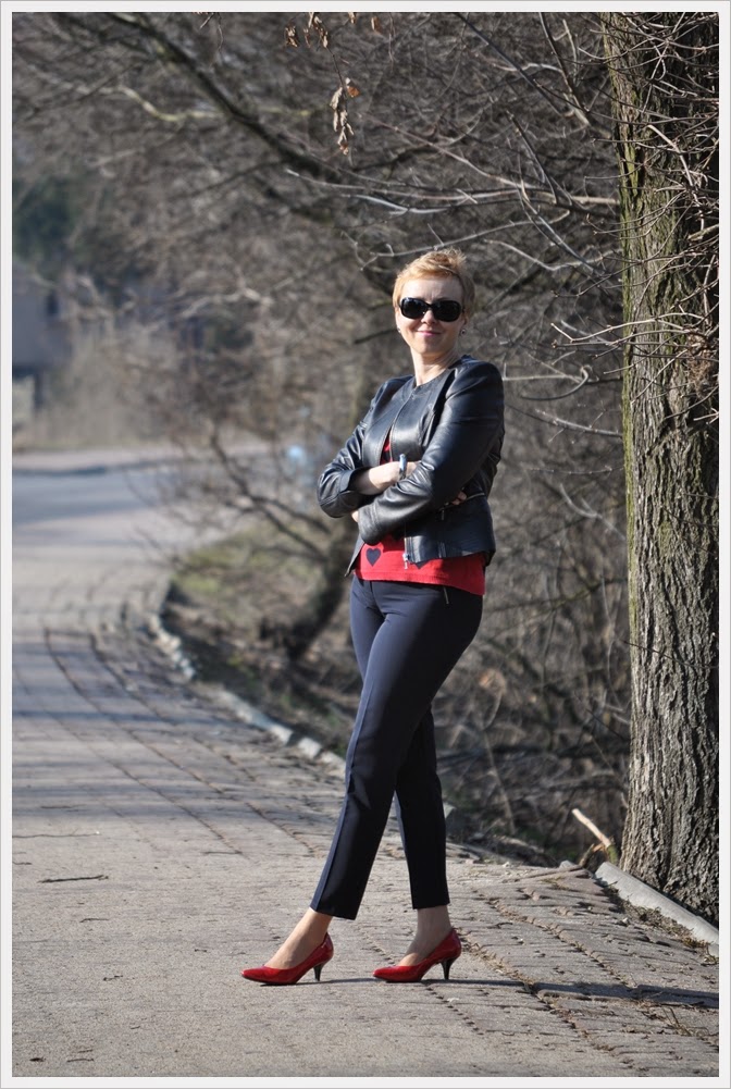 Dzisiejsza stylizacja jest uniwersalna. Można ją wykorzystać na wiele okazji: na wiosenny spacer, do pracy, na randkę. To już zależy od Was. Czerwony sweterek w granatowe serduszka kupiłam jakiś czas temu. Spodobał mi się, gdyż rękaw ma do łokcia i z tyłu wiązany jest na kokardkę. Ciekawe rozwiązanie. Skórzana grafitowa kurtka (nie lubię czerni) pasuje do wszystkiego. Postaram się przedstawić inne stylizacje z jej udziałem.